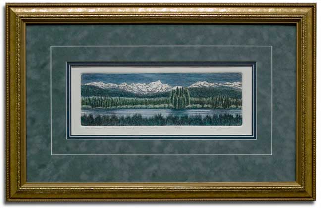 Gold colored frame, suede mat with v-groove, two dark blue mats.